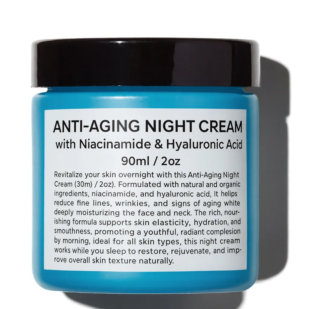 Revitalize your skin overnight with this Anti-Aging Night Cream (90ml / 2oz). Formulated with natural and organic ingredients, niacinamide, and hyaluronic acid, it helps reduce fine lines, wrinkles, and signs of aging while deeply moisturizing the face and neck.
